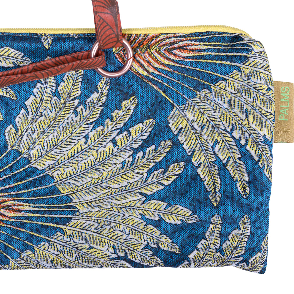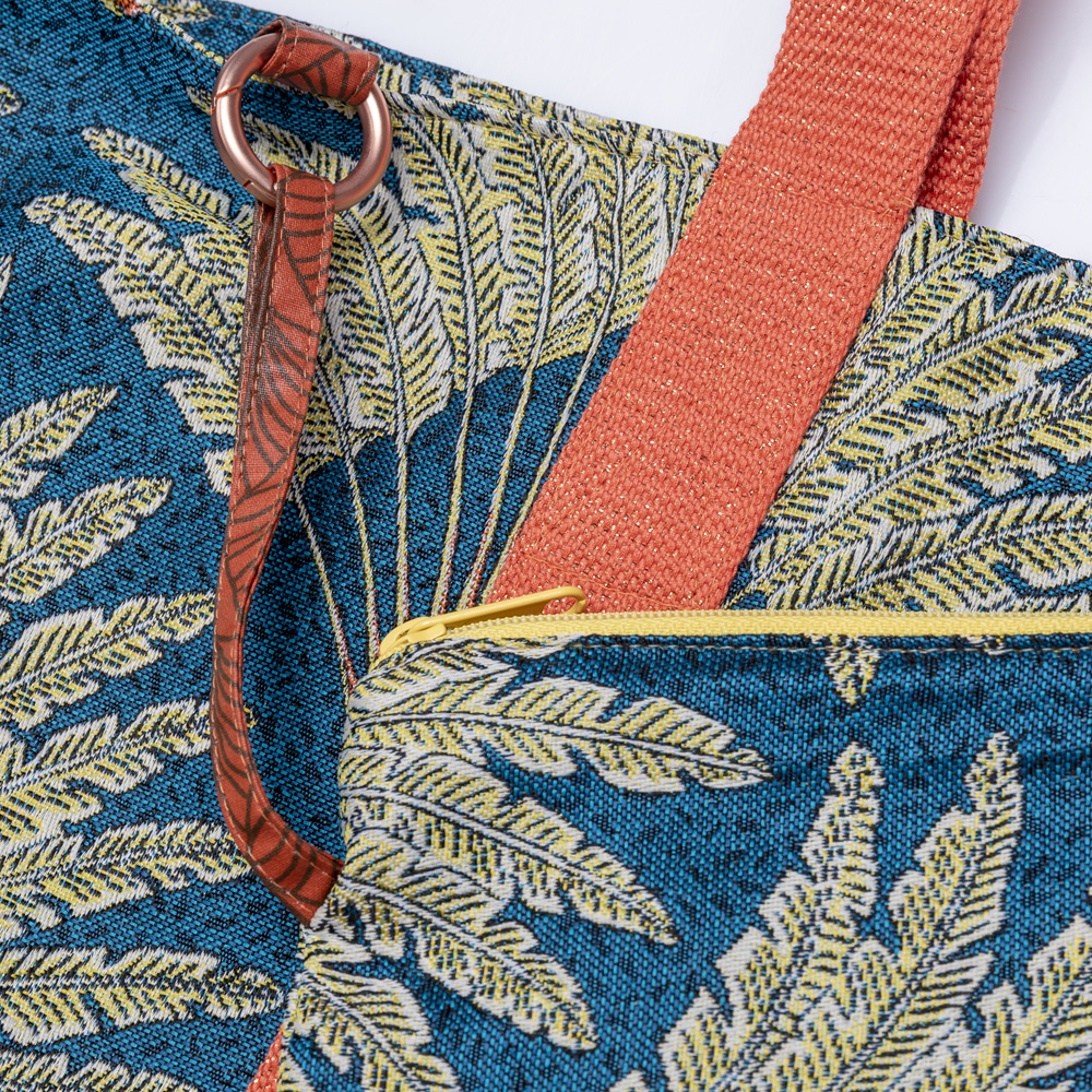 Der Oberstoff von diesem edlen PALMS Modell ist aus einem außergewöhnlichen Jacquardstoff mit gelbgoldenen Fächern auf dunkel petrolfarbenem Grund und einem goldfarbenen wasserabweisenden Kunstlederboden. Die robusten Trageriemen sind orange und mit einem goldenen Lurexfaden durchzogen.
