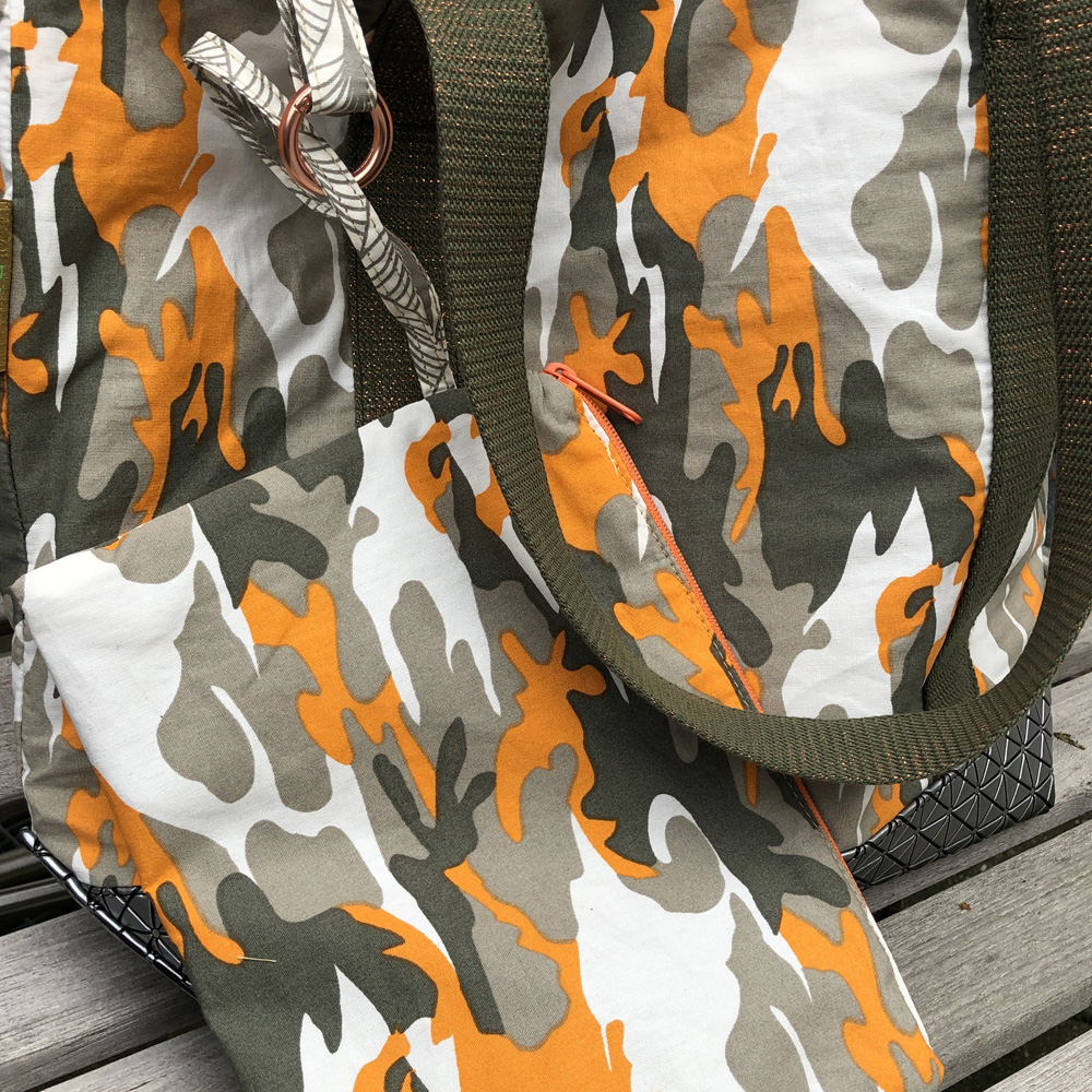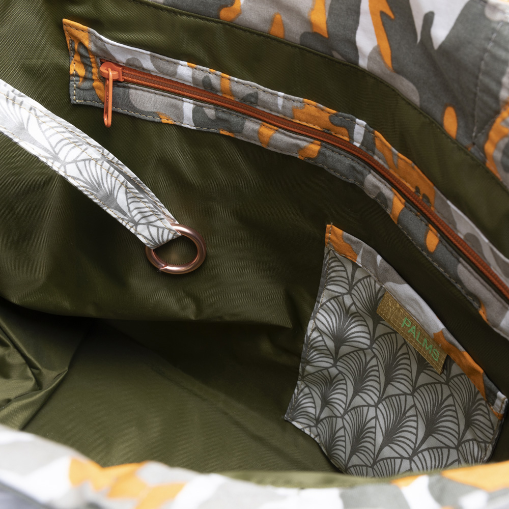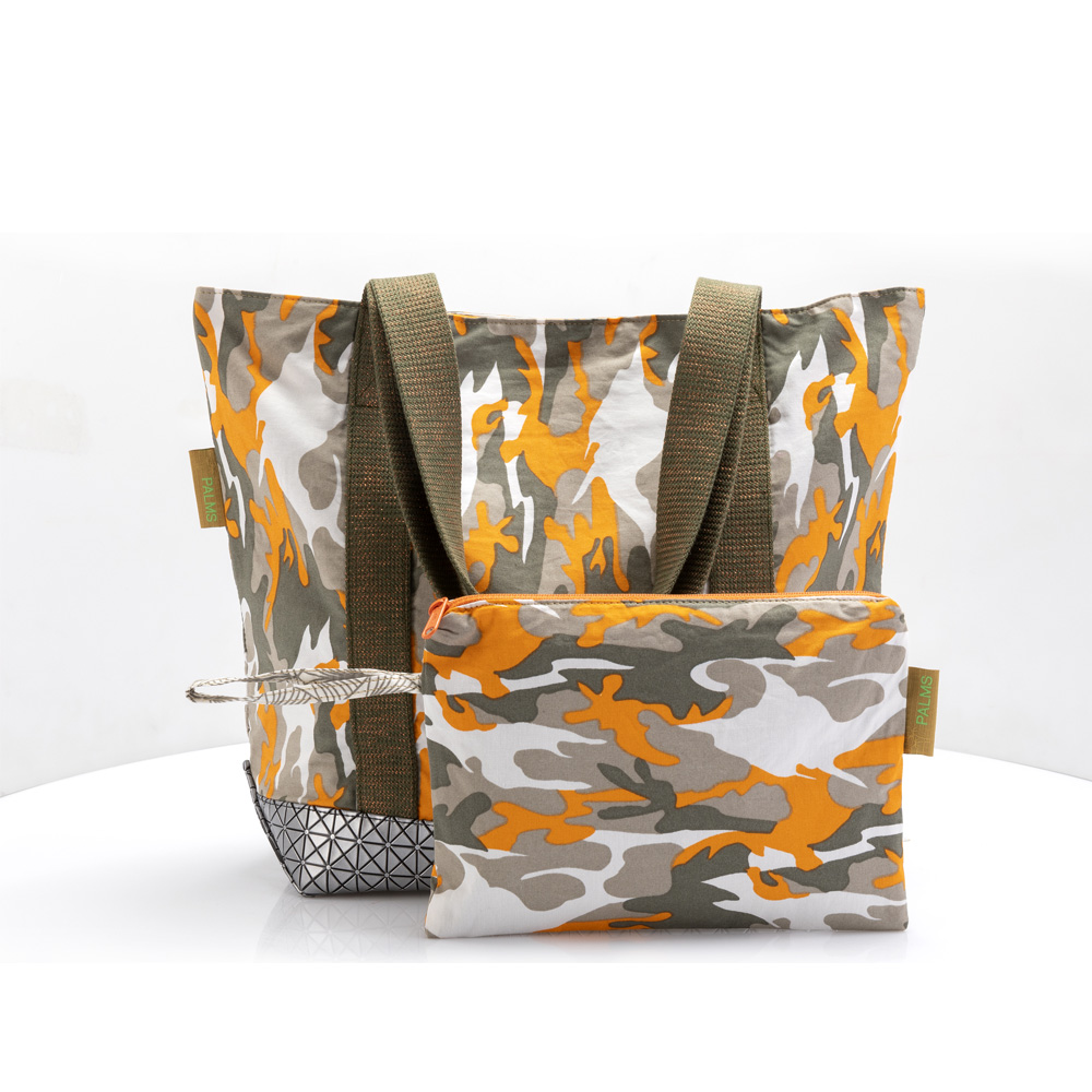 Dieses trendige Camouflage Modell besteht aus der Kombination von einem Baumwollstoff mit einem hochwertigen silberfarbenen wasserabweisenden Kunstlederboden mit dreidimensionalem Dreieck Design. Die robusten Trageriemen sind oliv und mit einem kupferfarbenen Lurexfaden durchzogen.