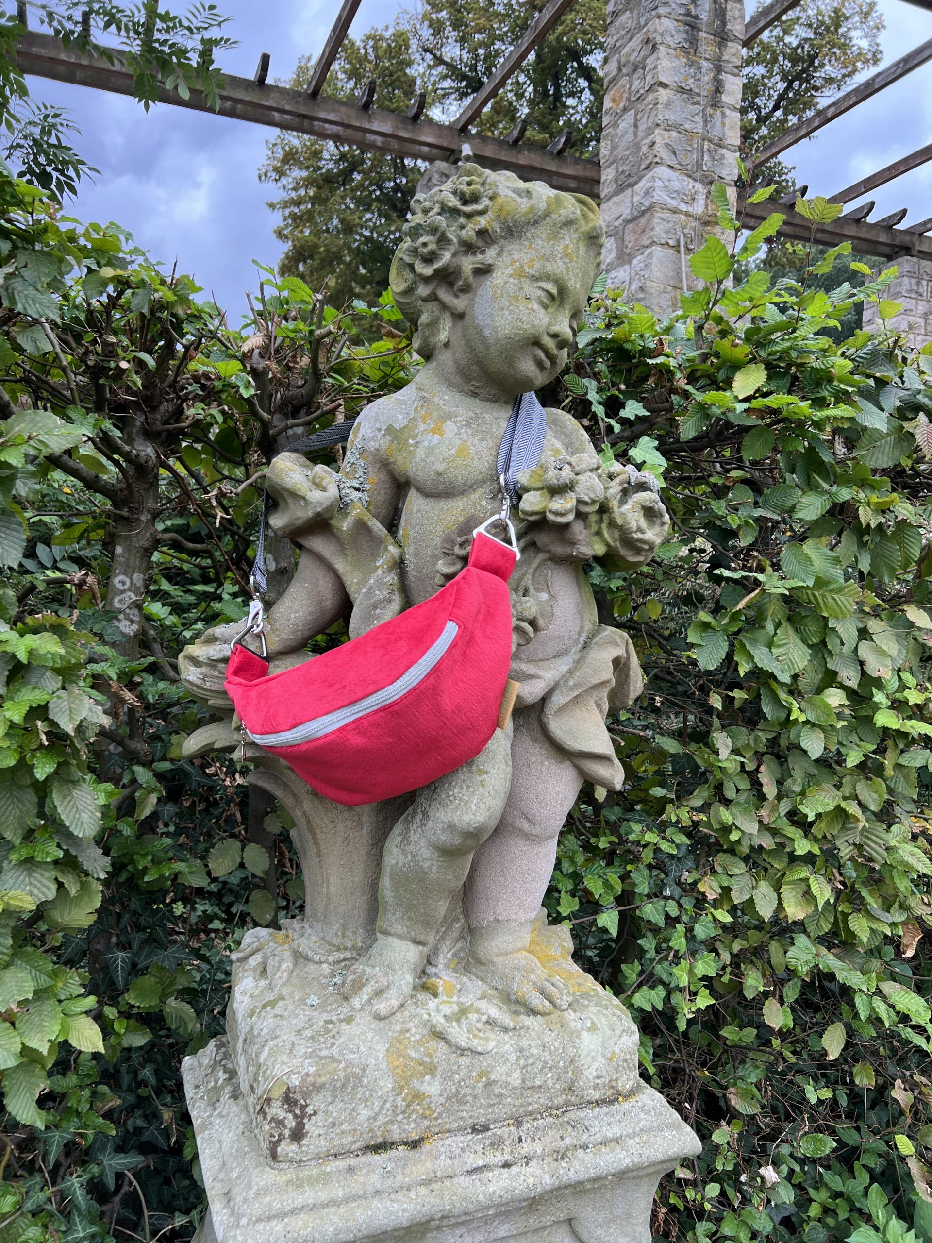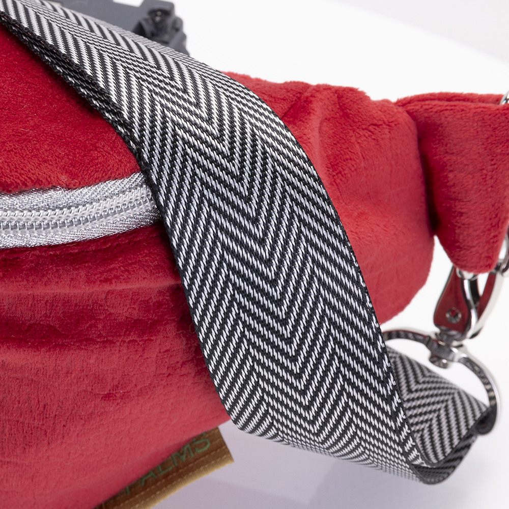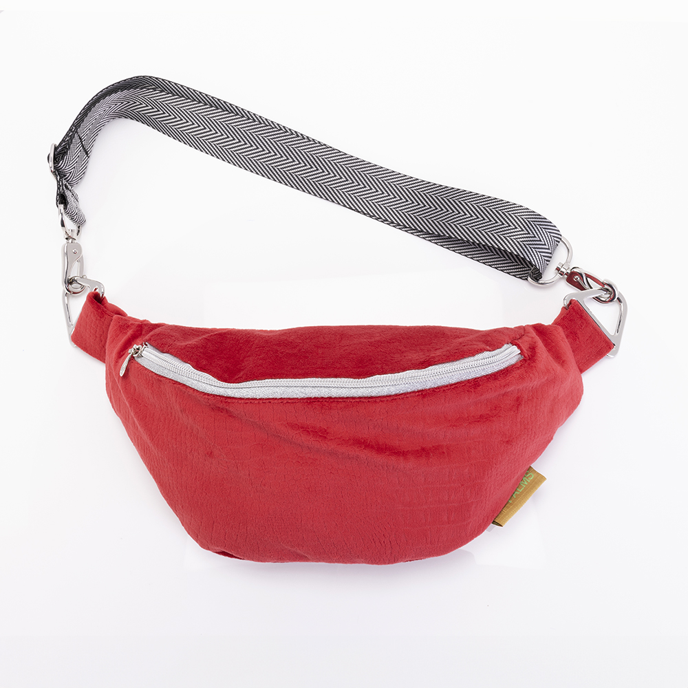 Crossbody Bag aus einem samtigen Material mit stylischem Krokoprint in einem wunderschönen warmen Rot. Dazu der schwarzsilberne Fischgrat-Tragegurt mit hochwertigen Karabinerverschlüssen.