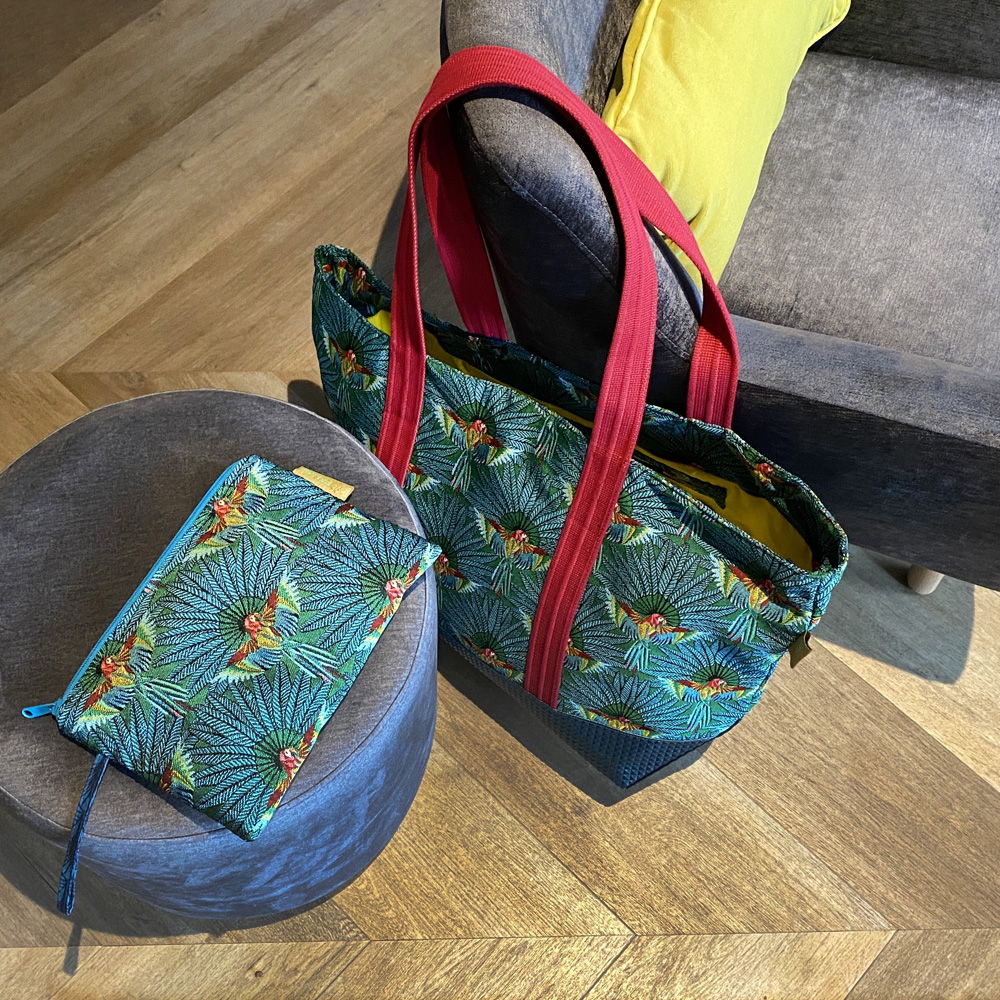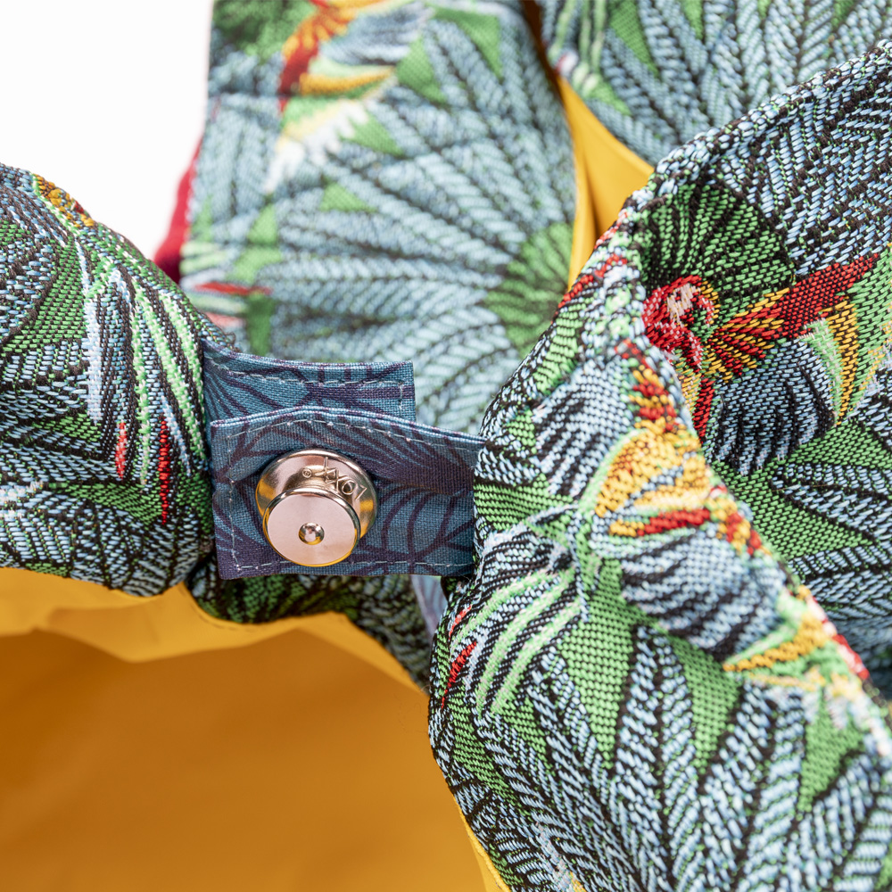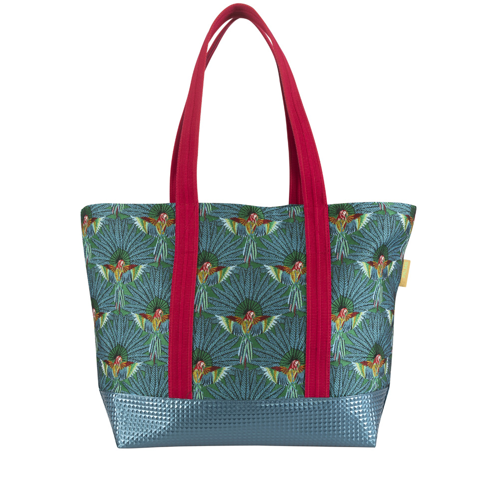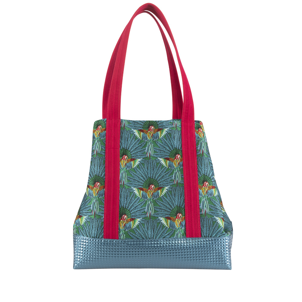 Dieses PALMS Maxi Bag signalisiert pure Lebensfreude durch das farbenfrohe Muster mit den kleinen Papageien. Dieser Jacquardstoff ist kombiniert mit einem wasserabweisenden glänzenden Kunstlederboden in petrol. Gehalten wird die Tasche durch sehr feste rote Baumwoll-Trageriemen.