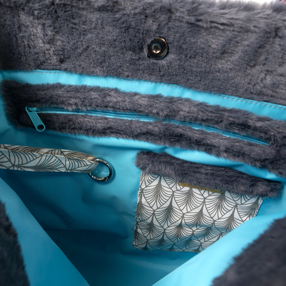 Im Innenleben befinden sich eine große Innentasche mit Reißverschluss und ein extra Handyfach. Dieses Modell hat einen Magnetdruckknopf als Verschluss. Zu der Tasche gehört eine kleine Clutch mit dem gleichen Ober- und Futterstoff.
