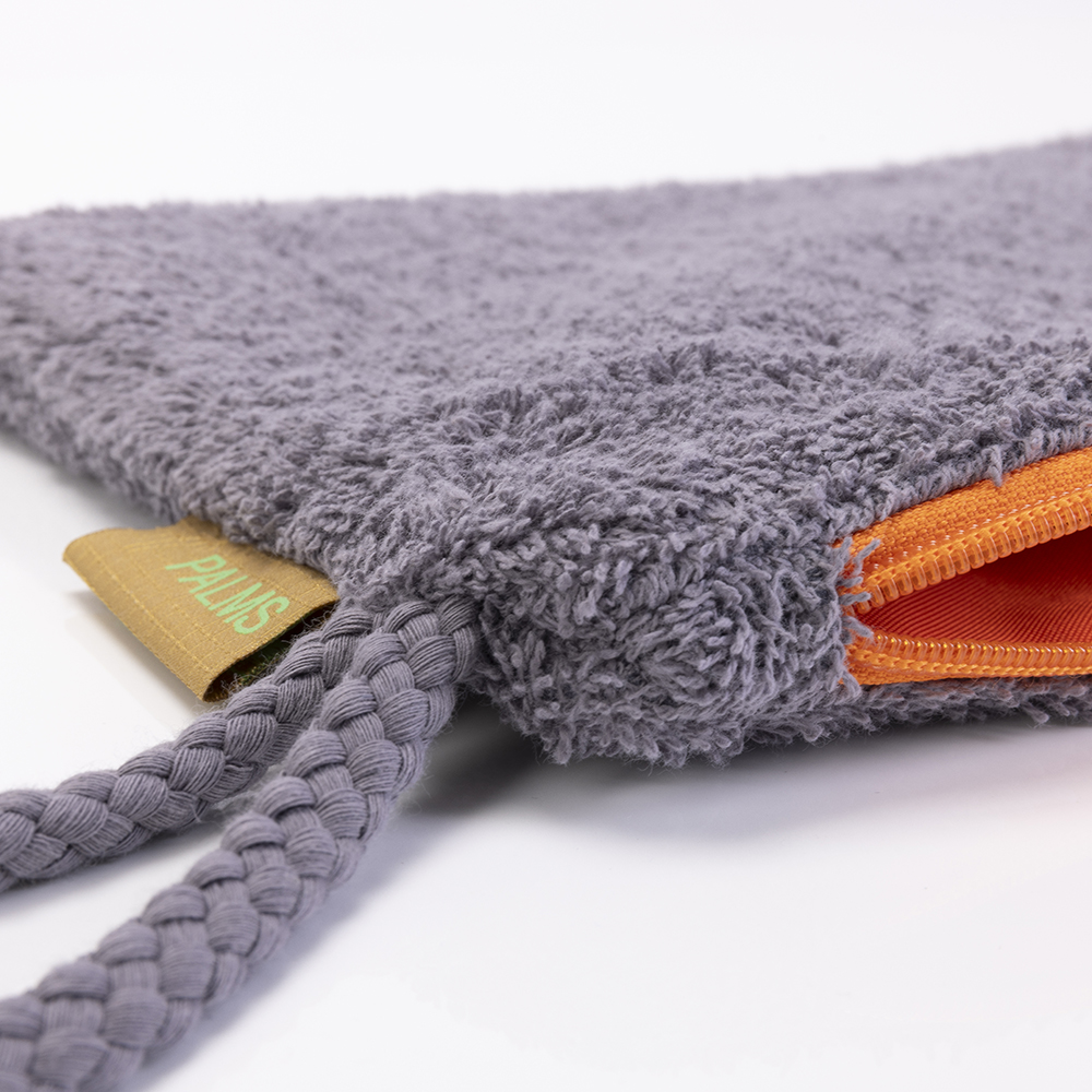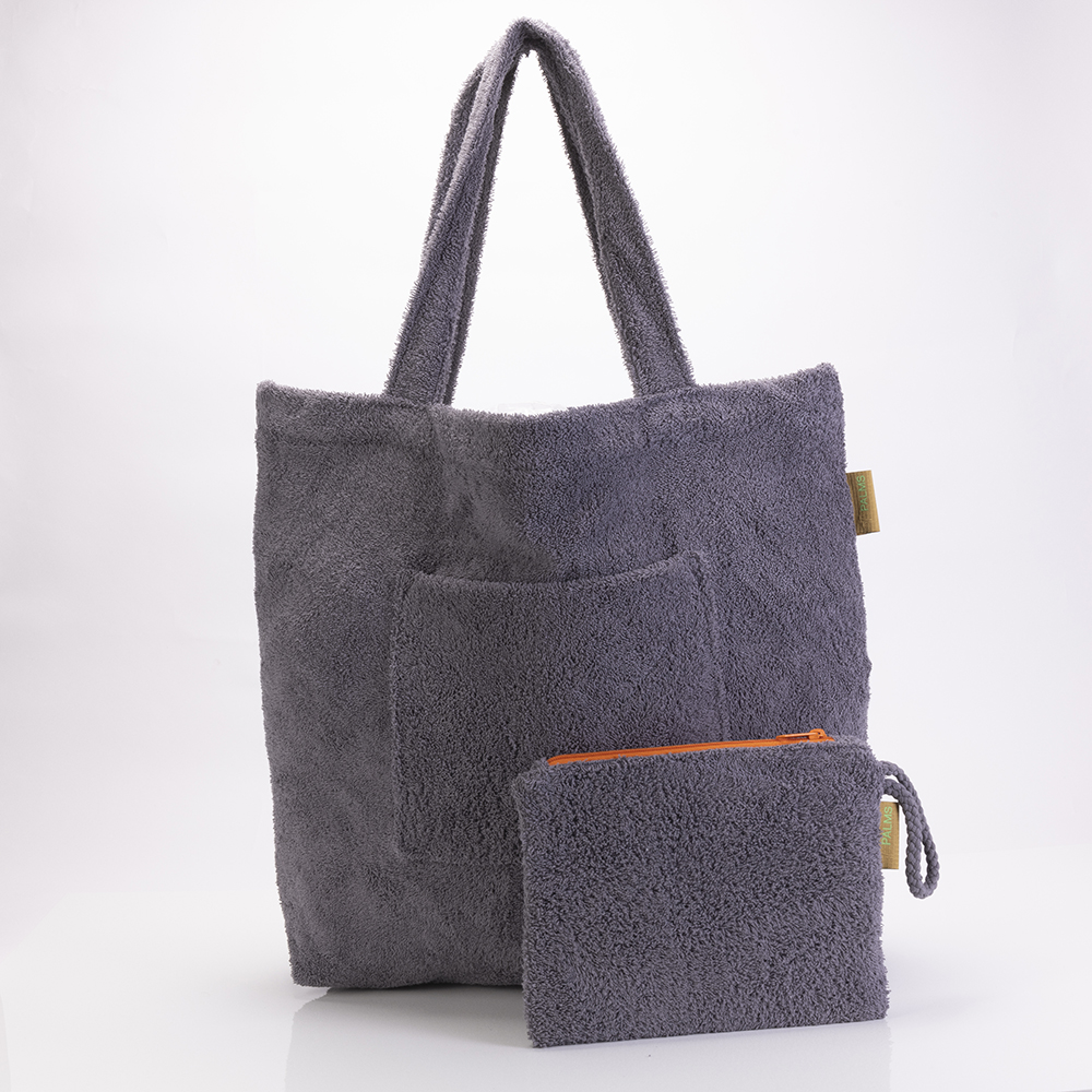 Große Strandtasche aus weicher Frottee-Qualität in Grau. Hier ist genügend Platz für alle Dinge, die man an einem Strandtag so benötigt. Diese Tasche ist auch der perfekte Begleiter zum Yoga oder Sport. Außen mit aufgenähtem Fach für Dinge, die schnell zur Hand sein sollen.