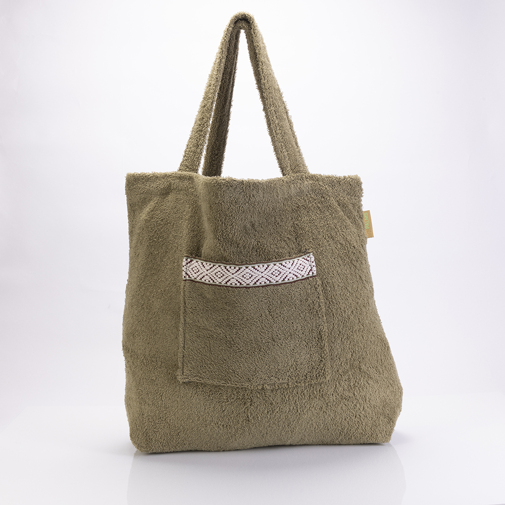 Große Strandtasche aus weicher Frottee-Qualität in der Farbe Khaki. Hier ist genügend Platz für alle Dinge, die man an einem Strandtag so benötigt. Diese Tasche ist auch der perfekte Begleiter zum Yoga oder Sport. Außen mit aufgenähtem Fach für Dinge, die schnell zur Hand sein sollen. Verziert mit einer schönen Bordüre