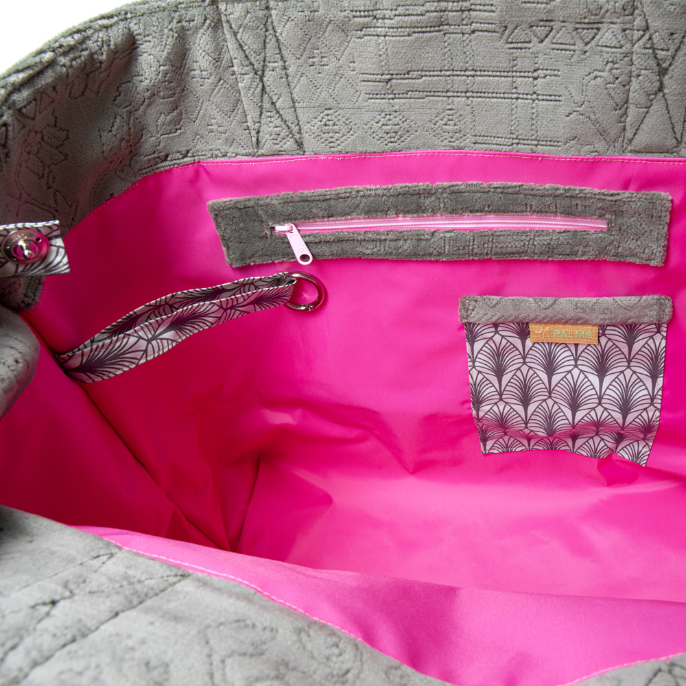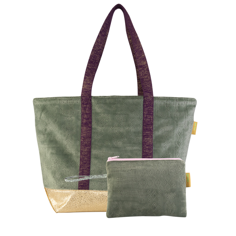 Der Oberstoff ist aus einem samtigen hochwertigen Polsterstoff, rauchgrün mit grafischen und floralen Mustern. Die Exklusivität dieses Modells wird unterstrichen durch die Kombination mit einem goldenen wasserabweisenden Kunstlederboden und einem purplefarbenem Trageriemen, der mit goldenen Lurexfäden durchsetzt ist. Das pinke Futter ist ebenfalls aus wasserabweisendem Material. So bleibt der Tascheninhalt auch bei Feuchtigkeit lange trocken.