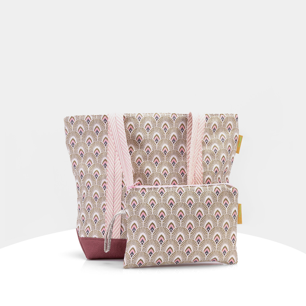 PALMS Midi Bag Modell Splendid Summer ist absolut alltagstauglich. Das Muster des Jacquardstoffes erinnert an ineinander geschachtelte Pfauenfedern, nur dass hier die Farben Beige, Rosa, Gold und Grau dominieren. Dazu ein farblich abgestimmter Trageriemen mit Fischgrätmuster und ein wasserabweisender Boden in Altrosa.