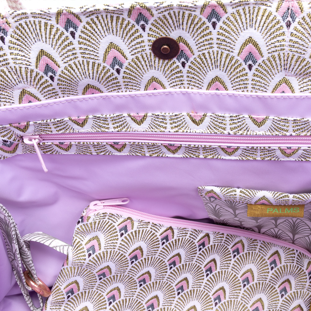 PALMS Midi Bag Modell Splendid Summer ist absolut alltagstauglich. Das Muster des Jacquardstoffes erinnert an ineinander geschachtelte Pfauenfedern, nur dass hier die Farben Beige, Rosa, Gold und Grau dominieren. Dazu ein farblich abgestimmter Trageriemen mit Fischgrätmuster und ein wasserabweisender Boden in Altrosa.