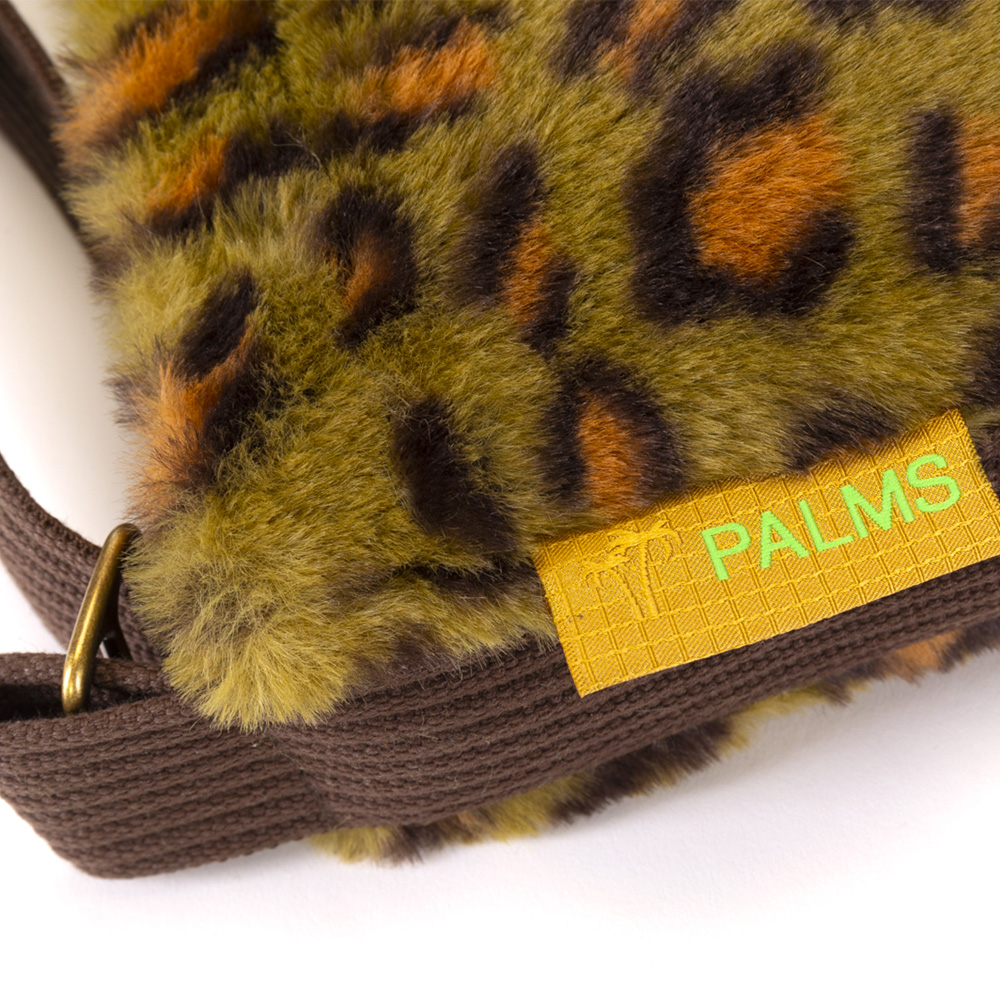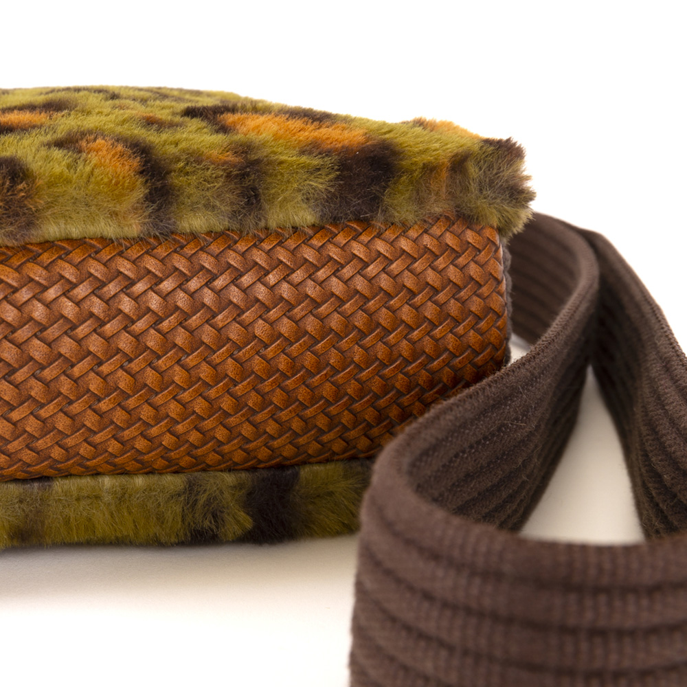 PALMS Mini Bag, zu tragen als kleine Umhängetasche oder als Cross Bag. In einem kuscheligem grünen Leo-Plüsch. Passend dazu ein längenverstellbarer Tragegurt in einem warmen Braunton. Der Boden ist aus Kunstleder in Fischgrätoptik. Beige gefüttert mit einem wasserabweisenden Nylon Material.