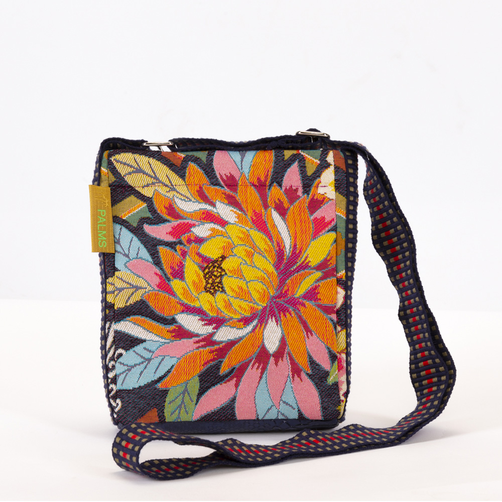 Diese PALMS Mini Bag ist so besonders, da jede Bag ein Einzelstück ist. Durch das große Muster sind Vorder- und Rückseite immer unterschiedlich. Natürlich kann man die Tasche beidseitig tragen, als kleine Umhängetasche oder als Cross Bag. Passend dazu ein längenverstellbarer Tragegurt in Blau-Khaki-Rot. Der Boden ist aus nachtblauem Kunstleder in Kroko-Optik. Pink gefüttert mit einem wasserabweisenden Nylon Material.