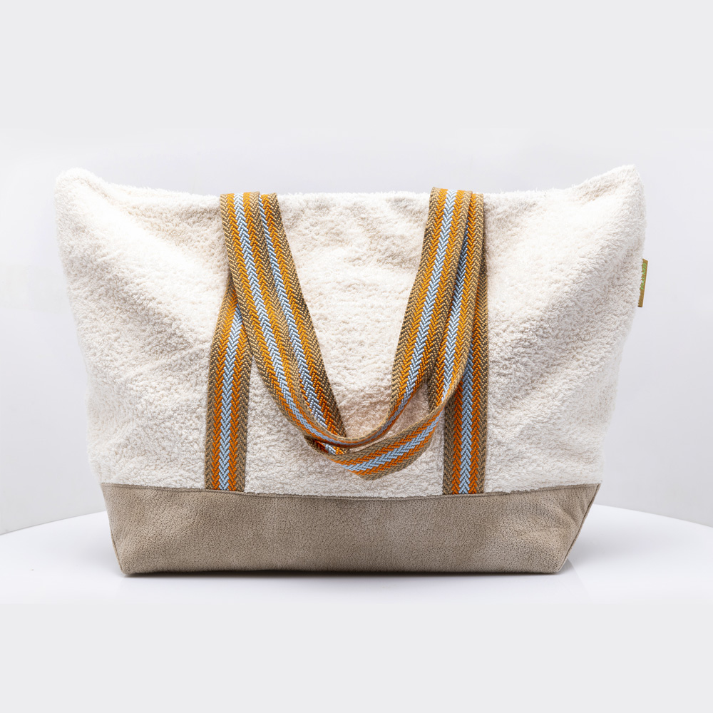 Ein cremefarbener Frotteestoff kombiniert mit einem stylischen Trageriemen vermittelt direkt die Lust auf Sonne, Strand und Meer.