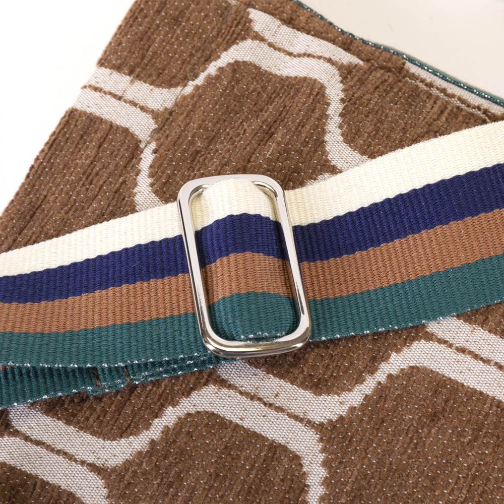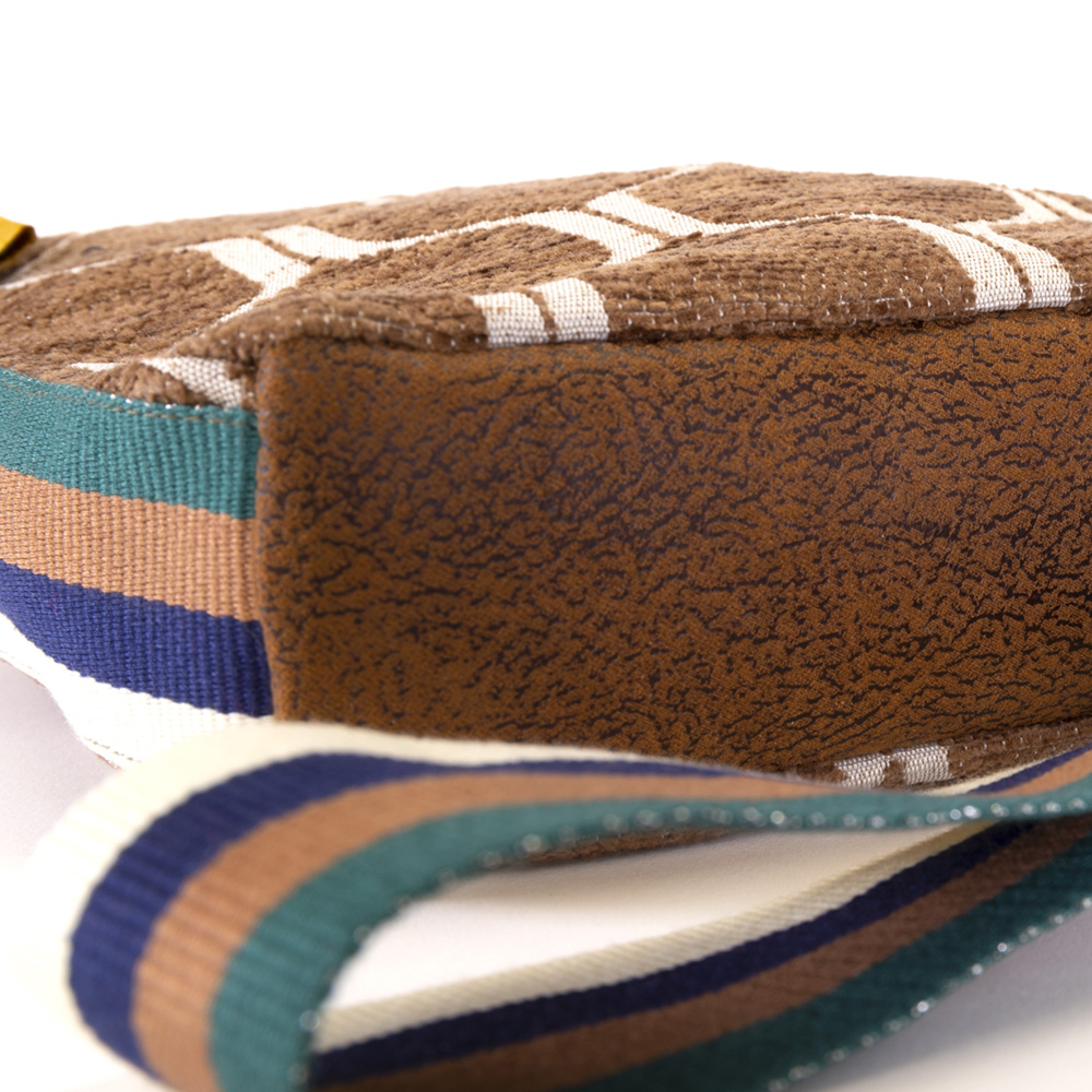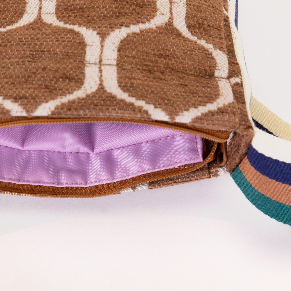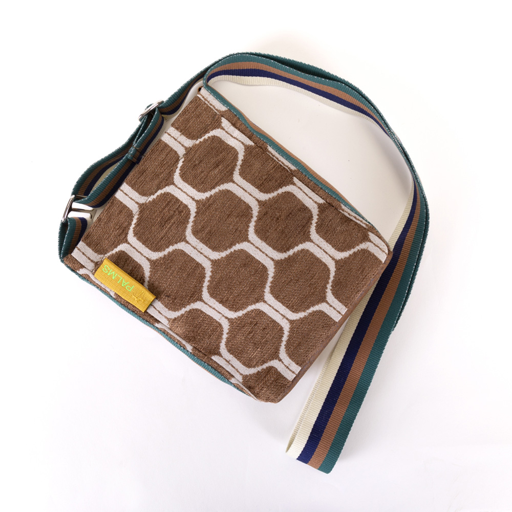 Eine PALMS Schultertasche im Retrostyle. Dazu das schöne vierfarbige Gurtband in creme/blau/braun/grün. Diese Tasche kann man einfach umhängen oder auch als Crossbody Bag tragen. Der Boden ist aus einem wasserabweisenden Material in einem passenden Braunton. Das rosafarbene Nylonfutter ist ebenfalls wasserabweisend.